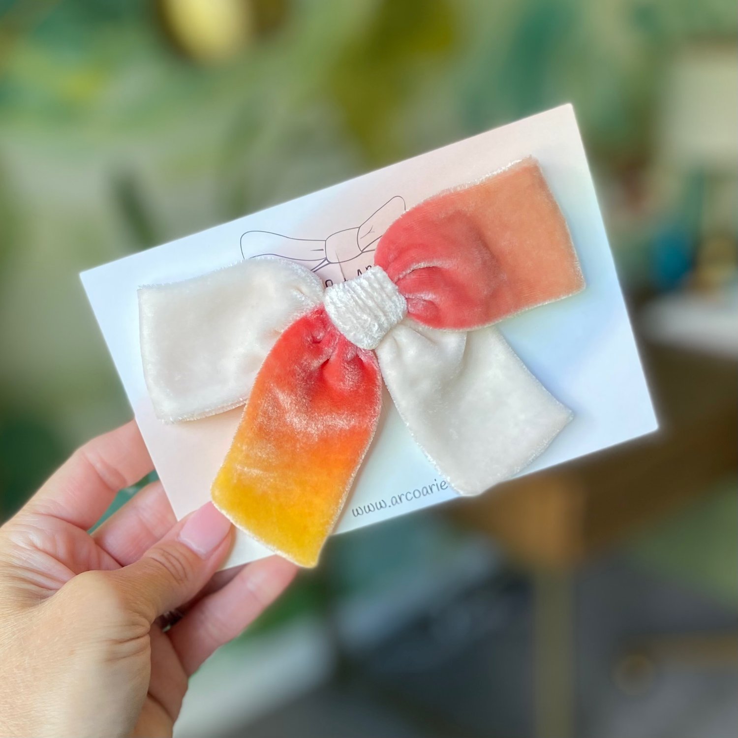 Limited silk velvet oversized chunky pinwheel bows custom dyed with everyone's favorite Loti in warm autumn colors! Both oversized styles measure about 5x3” and midi measures about 4x2.5”.