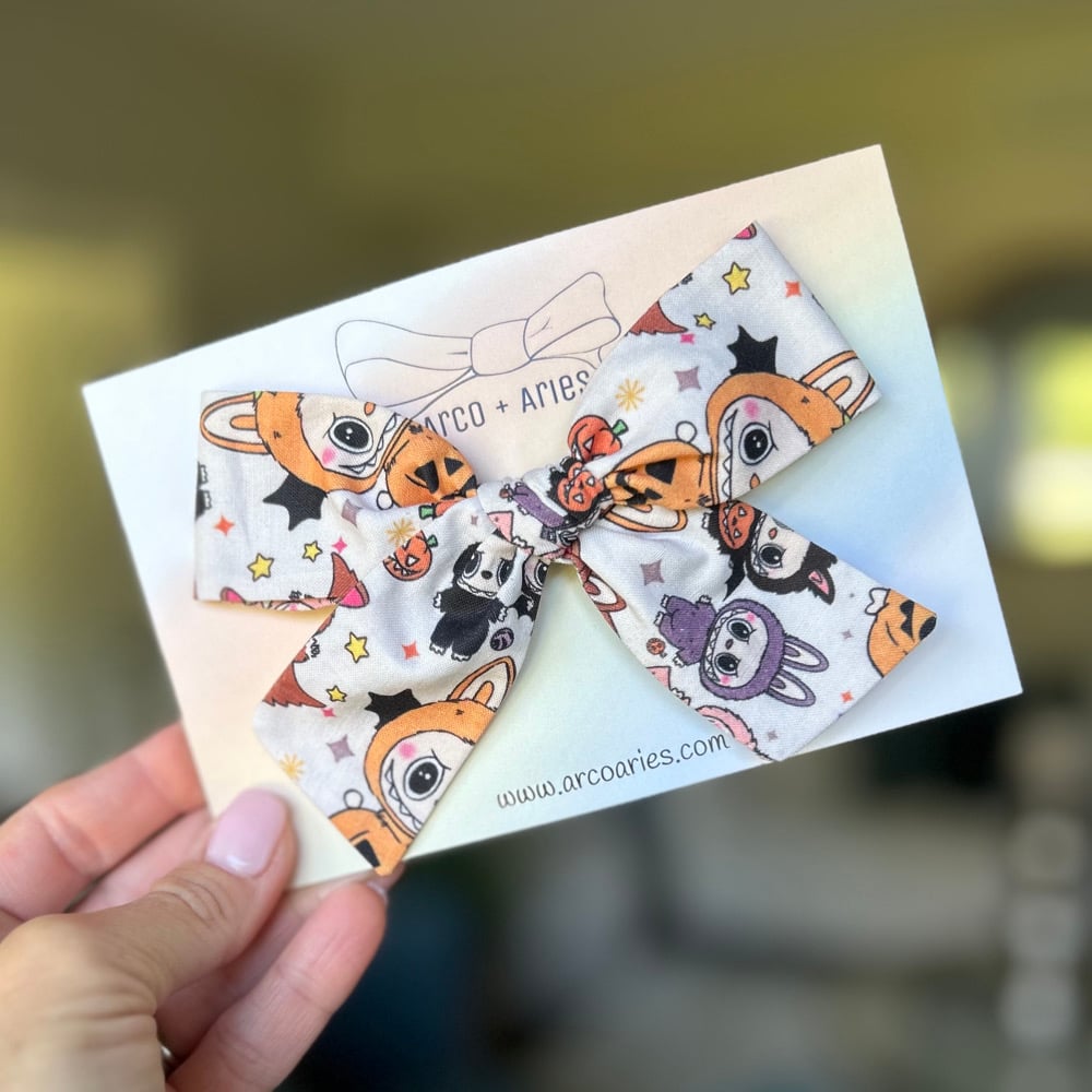 Adorable little Halloween labubu print in your choice of oversized schoolgirl or pinwheel bow! Both variants measure roughly 5x3 inches. Please let me know if you’d like to purchase a smaller size!