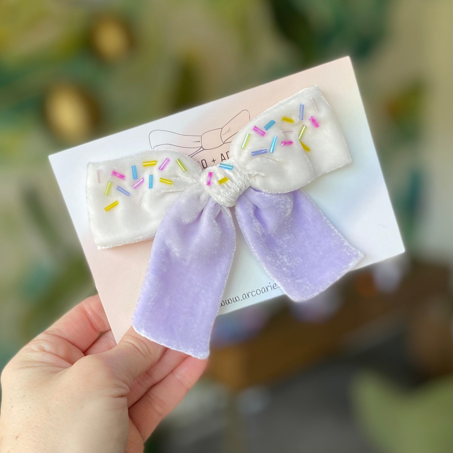 Specialty dyed pastel lavender silk velvet embellished with pastel sprinkles! Both oversized styles measure roughly 5”x3” and midibsize measures roughly 4”x3”